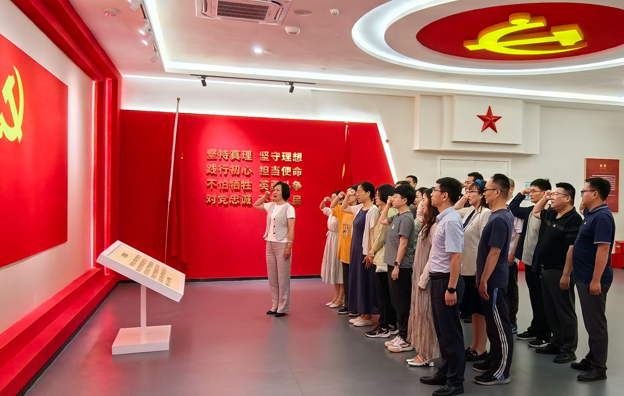 在延安精神无锡学习天地,跟随着讲解员的步伐,大家依次走过“中共中央和红军长征的落脚点、中国人民抗日战争的政治指导中心、创建新民主主义的模范试验区、实施党的建设伟大工程、毛泽东思想指导地位的确立、夺取全国胜利的出发点、延安精神的原生形态”七个展区,通过浏览镌刻着珍贵历史记忆的丰富影像资料及实物展示,走进新民主主义革命时期我们党老一辈革命家在延安自力更生、艰苦奋斗、全心全意为人民服务的光辉岁月,深入了解延安精神的形成背景、丰富内涵和时代价值,深刻理解毛泽东同志提出用“延安作风”打败“西安作风”的深远寓意。在延安精神展示馆,马克思主义学院党总支书记赵后起带领党员教师重温入党誓词,面向党旗,庄严宣誓,砥砺初心。