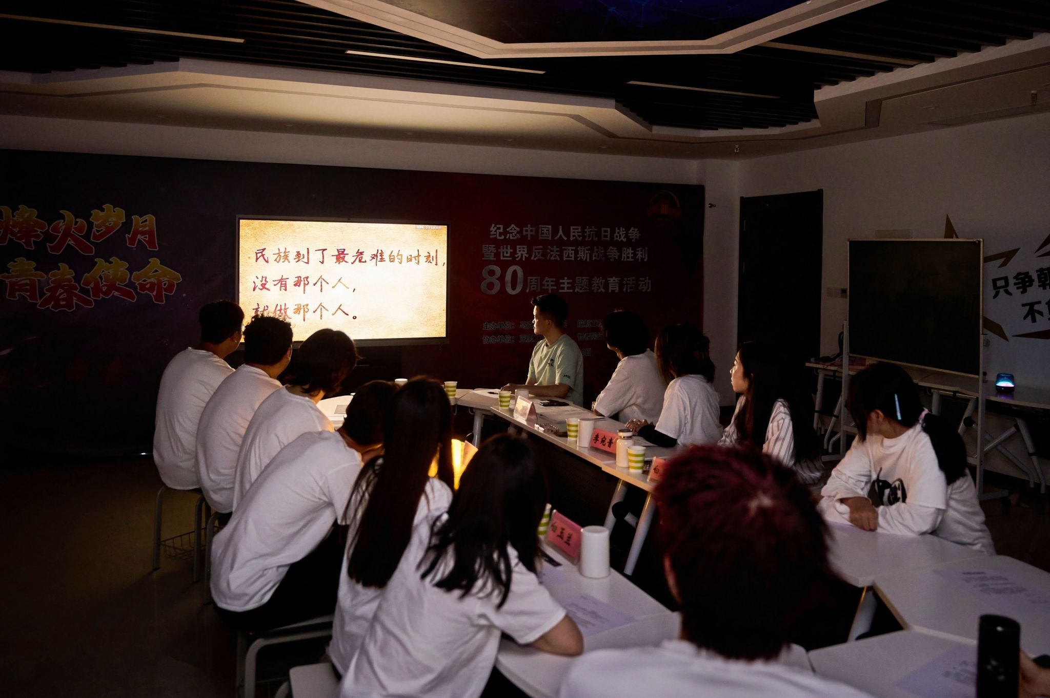 活动中,师生们在《兵临城下》的故事里穿越时空,走进1937年山西朔县保卫战的前夜,化身为爱国师生、平民百姓、商贾名流、铁血军人,面对日寇铁蹄将近、国破家亡的命运,在艰难的生死抉择中,挺身而出,担当起挽救家国、拯救民族的重任。在一幕幕剧情的推进中,有些人抱定抗战决心,有些人由犹豫迟疑到消弭隔阂,最终走向坚定抗日,在沉浸式场景中,师生们由一开始与角色有些许疏离,逐渐融入那个战火纷飞的年代,全情投入到角色中,切身体悟生死存亡背景下,平凡个体的家国情怀、民族气节与牺牲精神,在最后一幕,大家激昂宣誓“愿我华夏子孙,共洒最后一滴血,于雁门关外,中华民族历战之地,为人类张正义,为民族争生存……”将整个活动推向高潮。